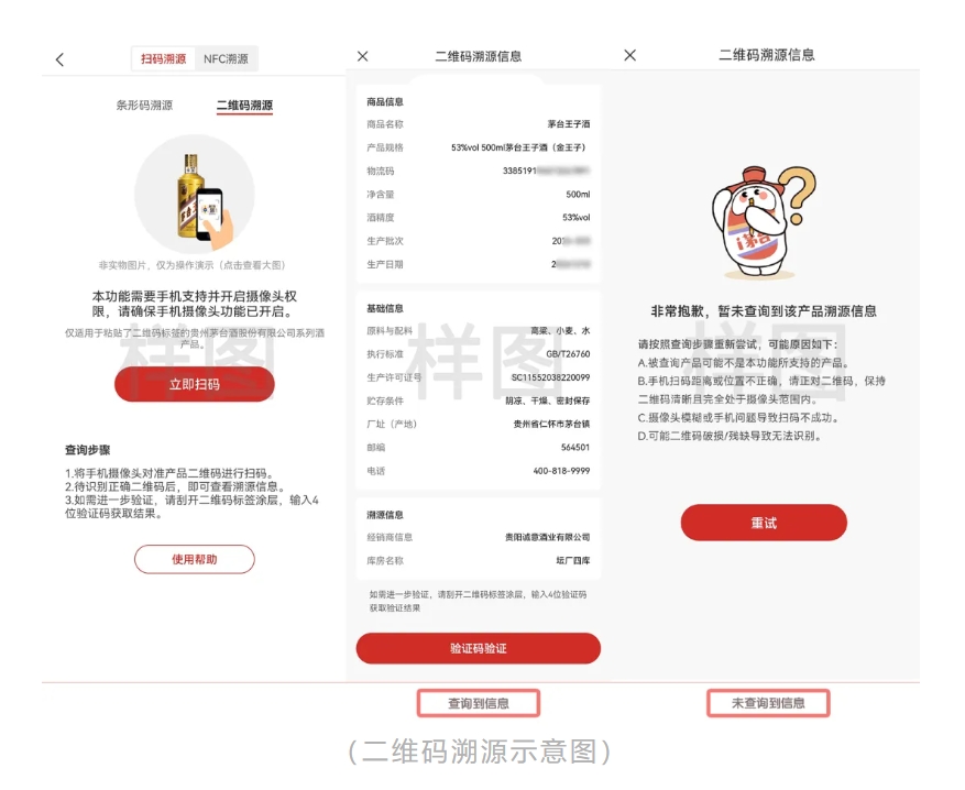 但是大家知道,無論是條形碼還是二維碼都是以明碼方式貼在瓶身上的,存在容易被復制、被轉移的風險,通過掃描復制品或者移動后的條形碼或二維碼也能得到溯源信息。因此,小茅提醒親們,條形碼和二維碼溯源方式僅適用于真實產品的溯源,讓親們能了解產品從包裝生產到終端的相關流通信息。