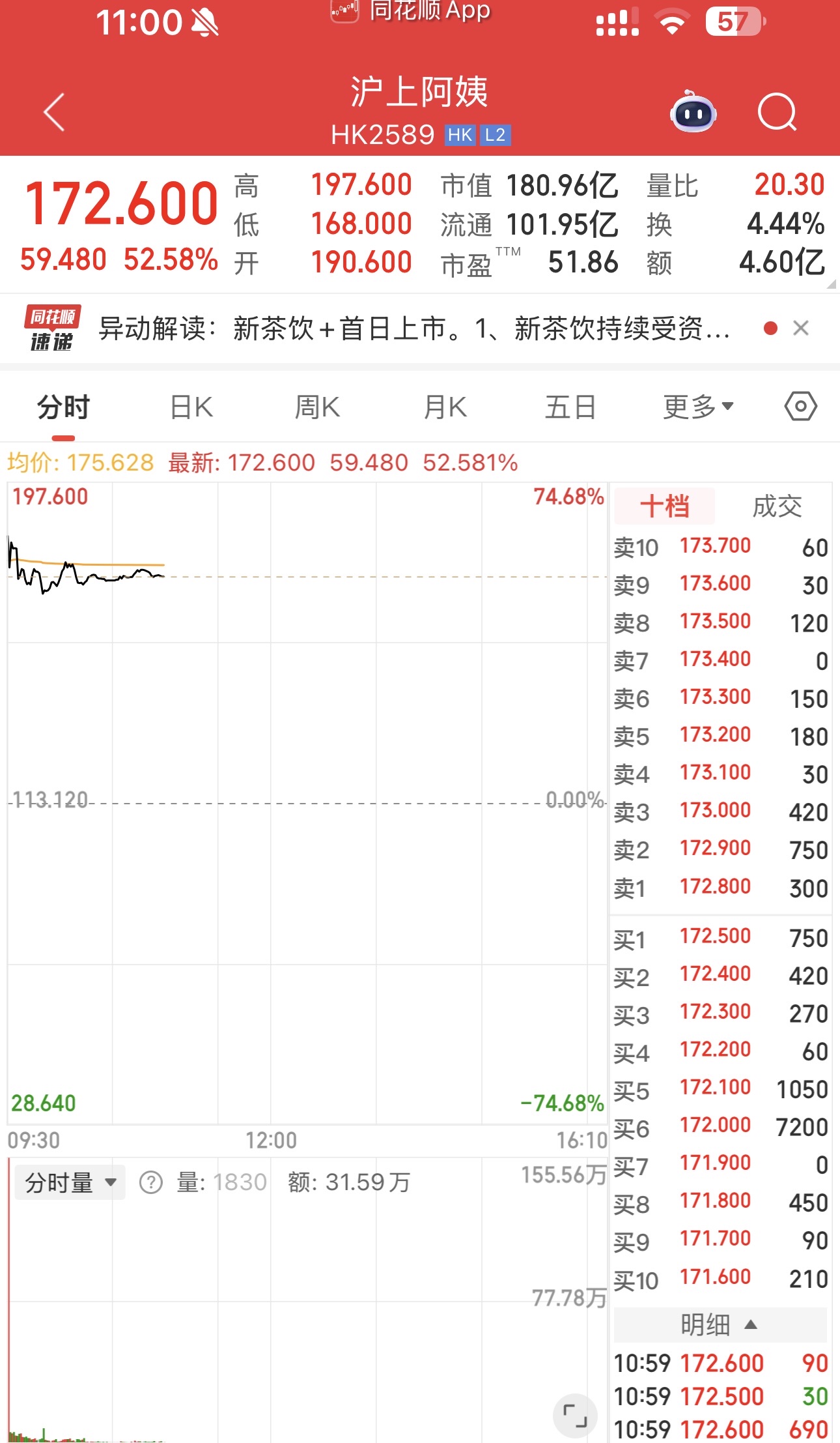 滬上阿姨盤中漲幅最高達68%,報197.6港元/股,截至上午11點滬上阿姨報于每股172.60港元/股,漲超52.58%,市值180.96億港元。