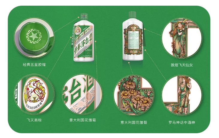 貴州茅臺酒(走進系列·意大利)提取意大利國旗的綠色和國花雛菊的白色匯入產品設計之中,融合文藝復興與東方神韻,共譜東西文明交響樂章。