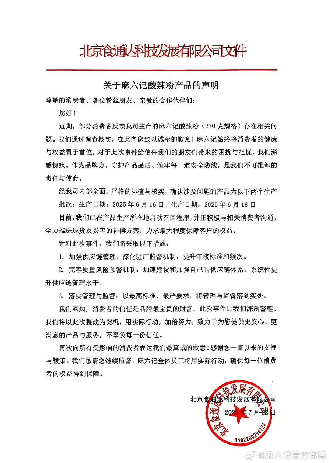 本報訊 (記者李靜)7月28日下午,麻六記官方微博發表聲明道歉,稱經公司內部排查與核實,確認涉及問題的產品為生產日期為2025年6月16日、6月18日的兩個生產批次。麻六記稱,目前,公司已在產品生產所在地啟動召回程序,并正積極與相關消費者溝通,全力推進退貨及妥善的補償方案,力求最大程度保障客戶的權益。