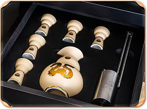 茅臺王子酒(25周年紀念)配備了設計精美的酒具。這些酒具以匠心打造,其中葫蘆分酒器,同時也是茶具中的公道杯,酒或茶倒出來之時,寓意著“福到了”;乾坤杯,正放為茶杯(象征“坤”,地之沉穩),倒置為酒杯(象征“乾”,天之靈動),一器雙用,體現“陰陽相生”的哲學思想。品茗靜心、把酒言歡,皆能隨心切換,在器皿流轉間,感受傳統哲學和東方美學的當代意境。