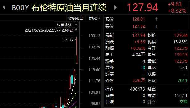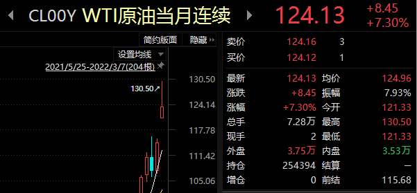 北京時間3月7日,美、布原油期貨再次迎來大漲。其中,布倫特原油一度漲逾10%,升至139.13美元/桶,而WTI原油期貨則突破130美元/桶。截至11點12分記者發稿,布倫特原油和WTI原油分別報128.77美元/桶、124.40美元/桶,今年以來累計漲幅均超65%。