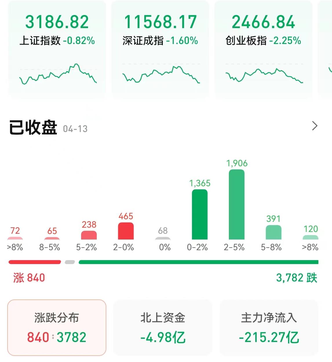 4月13日,A股三大指數呈現震蕩回落態勢。截至收盤,上證指數跌0.82%報3186.82點,深證成指跌1.6%報11568.17點,創業板指跌2.25%報2466.84點;兩市合計成交8734億元,北向資金凈賣出4.98億元。
