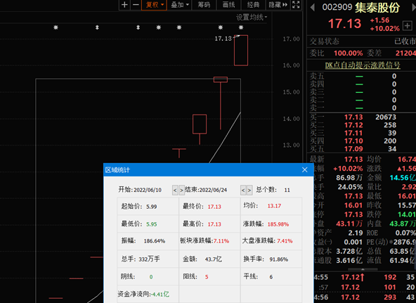 6月24日集泰股份再度漲停,已連收11個漲停板。截至收盤,該股報17.13元,換手率24.05%,成交額14.56億元,總市值63.85億元。6月10日至今,集泰股份累計漲幅達185.98%。