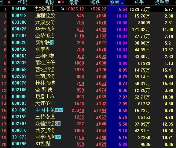 具體來看,6月30日上午,旅游酒店板塊異軍突起,漲幅達(dá)5.54%,其中,通程控股、元成股份、華天酒店、金陵飯店、新華聯(lián)、張家界、三湘印象、麗江股份等8只旅游股集體漲停。
