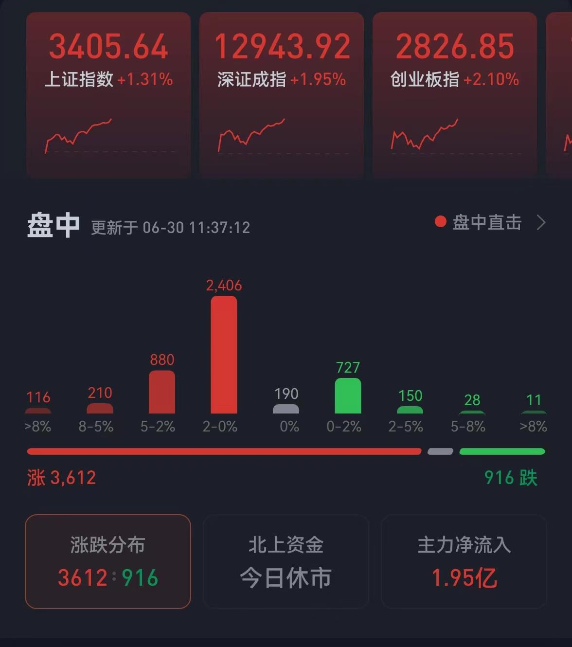 周四(6月30日),三大股指震蕩上揚(yáng),全線飄紅。截至上午收盤,上證指數(shù)漲1.31%,報3405.64點(diǎn),重新站上3400點(diǎn)整數(shù)關(guān)口;深證成指和創(chuàng)業(yè)板指漲幅分別為1.95%和2.1%;滬深兩市合計成交額6922.7億元;總體來看,兩市個股漲多跌少,上漲個股達(dá)3612只,僅有916只個股下跌。