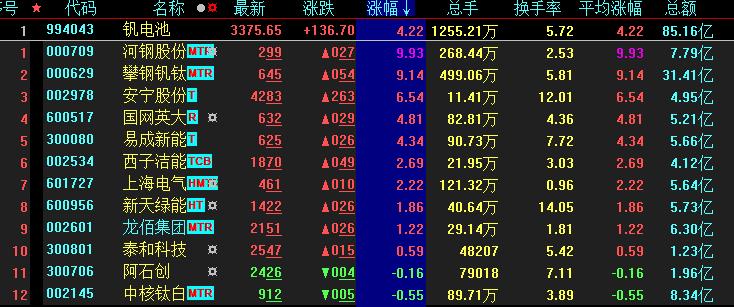 具體來(lái)看,7月12日上午,釩電池板塊繼續(xù)上揚(yáng),漲幅達(dá)4.22%,其中,河鋼股份再度漲停,實(shí)現(xiàn)2連板。攀鋼釩鈦、安寧股份等概念股漲幅均超5%。