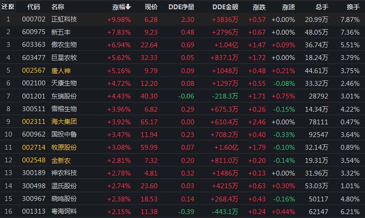 從申萬一級行業來看,截至7月29日上午收盤,農林牧漁行業漲幅居首,達1.8%,其中,正虹科技漲停。
