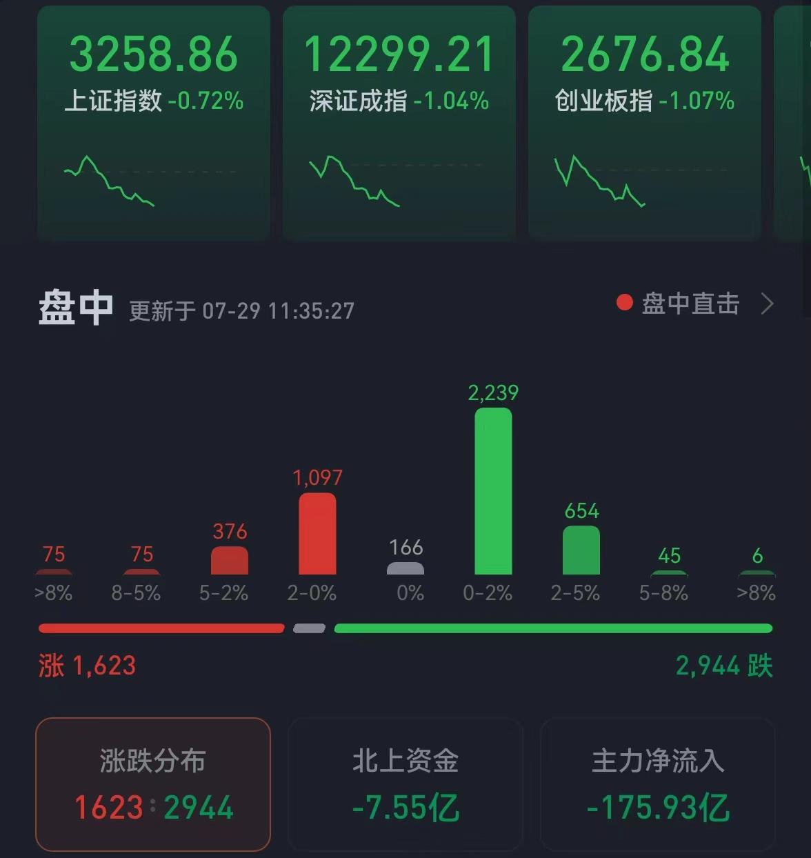 周五(7月29日),三大股指震蕩回落。截至上午收盤,上證指數跌幅達0.72%,報3258.86點;深證成指和創業板指跌幅分別為1.04%和1.07%;滬深兩市合計成交額6223.8億元,總體來看,兩市個股跌多漲少。