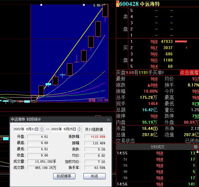 8月25日,熱門股中遠(yuǎn)海特再度漲停,截至收盤,報(bào)9.68元,實(shí)現(xiàn)11連漲,期間累計(jì)漲幅達(dá)110.89%。