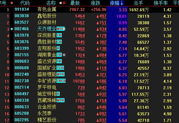 具體看,截至9月20日上午收盤,有色金屬板塊漲幅居首,達3.33%。其中,鑫鉑股份、眾源新材等2只個股漲停,天齊鋰業和深圳新星等個股漲幅均超8%。