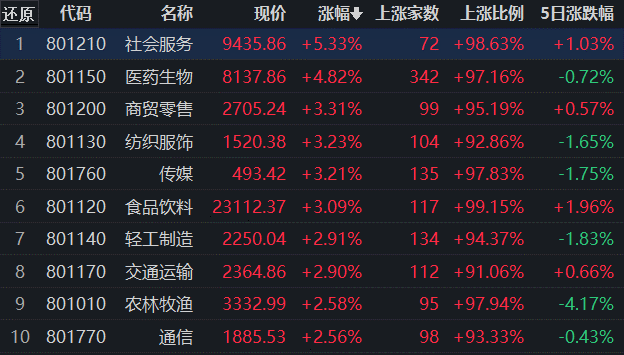 申萬一級行業(yè)方面,31類行業(yè)中有29類上漲,占比93.55%,其中,社會服務(wù)行業(yè)漲幅居前,達(dá)5.33%,醫(yī)藥生物和商貿(mào)零售分別以4.82%和3.31%排名第二與第三位;下跌方面,煤炭和石油石化等兩類行業(yè)下跌,跌幅均為0.37%。