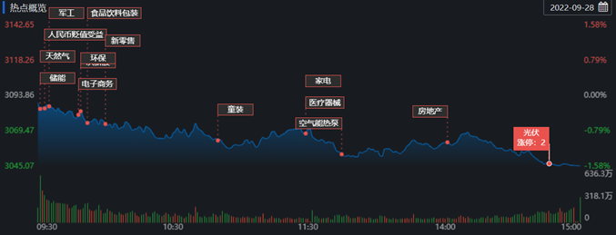 截至9月28日收盤,上證指數(shù)跌1.58%,收報3045.07點,深證成指跌2.46%,收報10899.70點,創(chuàng)業(yè)板指跌2.57%,收報2313.77點;滬深兩市合計成交額6472.56億元,較前一交易日縮減2.85%;北向資金凈賣出38.40億元;總體來看,A股中上漲個股為438只,下跌個股4463只。