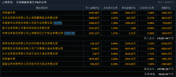 據(jù)同花順機(jī)構(gòu)成功率回測顯示,深股通專用買入3970.48萬元,該營業(yè)部買入后,次日上漲概率50%,平均盈利0.31%。收益率最高的是持股1天后賣出,收益率0.31%,成功率50%。東吳證券股份有限公司上海西藏南路證券營業(yè)部買入3080.65萬元,該營業(yè)部買入后,次日上漲概率36%,平均盈利-1.36%。收益率最高的是持股1天后賣出,收益率-1.36%,成功率36%。