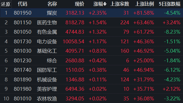 申萬一級行業(yè)方面,31類行業(yè)中有10類上漲,占比32.26%,其中,煤炭行業(yè)漲2.35%,居首;下跌方面,房地產(chǎn)行業(yè)居首,跌幅達(dá)2.28%。