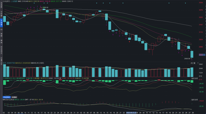 本周(10月24日-10月28日,下同),A股三大股指全線下跌。上證指數(shù)周跌幅達(dá)4.05%,報(bào)2915.93點(diǎn);深證成指周跌幅達(dá)4.74%,報(bào)10401.84點(diǎn);創(chuàng)業(yè)板指周跌幅達(dá)6.04%,報(bào)2250.51點(diǎn)。