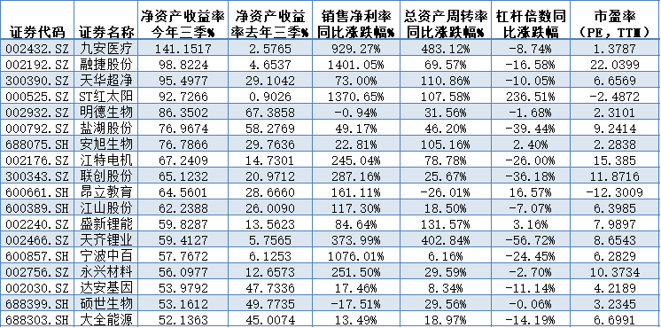 表:2022年前三季度報告凈資產(chǎn)收益率超50%公司一覽表