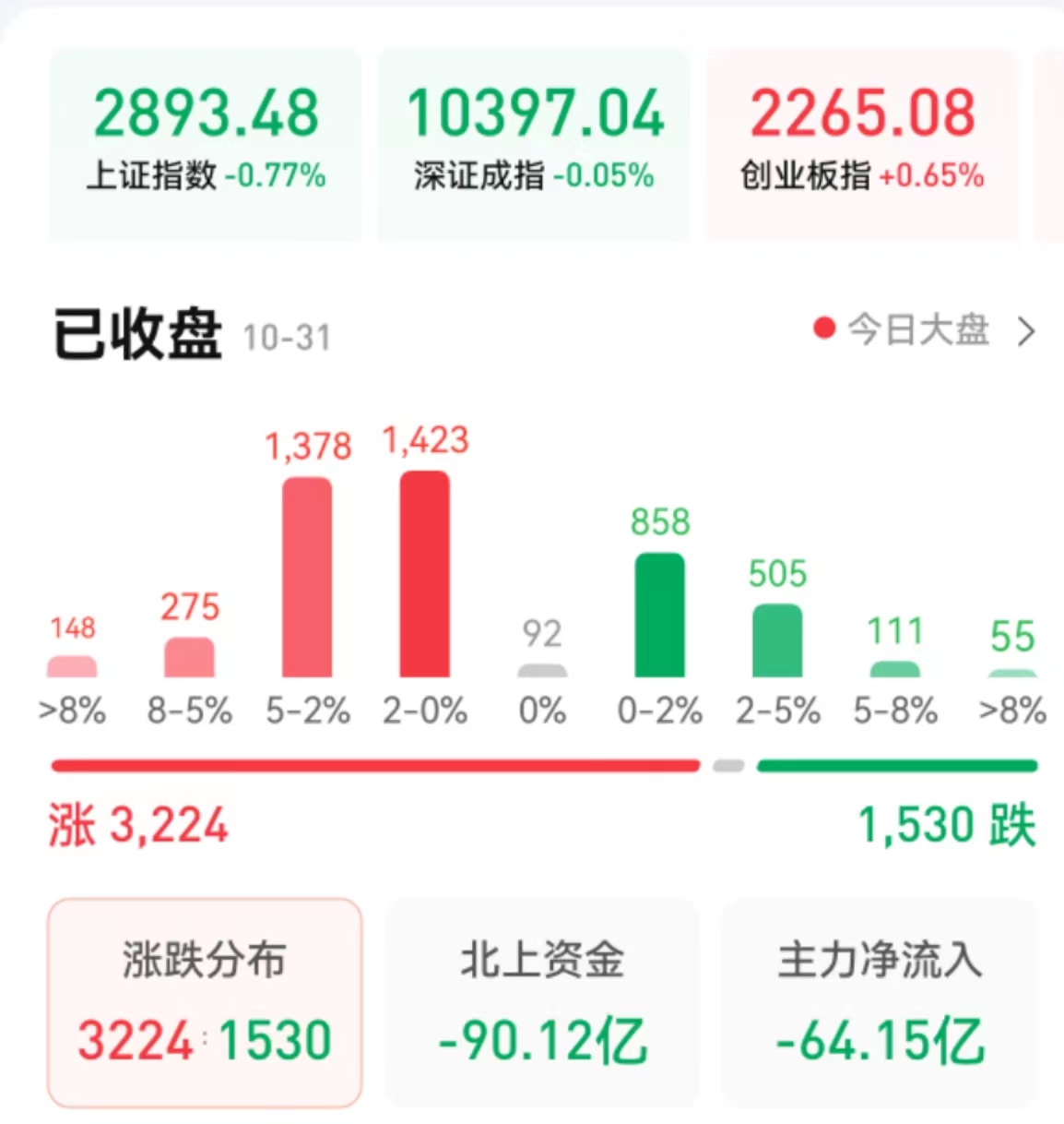 10月31日,A股三大指數收盤漲跌不一,上證指數跌破2900點整體關口。截至收盤,上證指數跌幅達0.77%,報收于2893.48點;深證成指跌幅達0.05%,報收于10397.04點;創業板指漲幅達0.65%,報收于2265.08點;滬深兩市合計成交額8832億元;北向資金凈賣出金額達90.12億元;總體來看,A股個股漲多跌少。