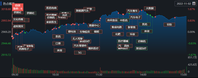 截至11月2日收盤,上證指數漲1.15%,收報3003.37點,深證成指漲1.33%,收報10877.51點,創業板指漲1.63%,收報2375.86點;滬深兩市合計成交額10521.4億元,較前一交易日增長7.63%;北向資金凈賣出75.82億元;總體來看,A股中上漲個股為3568只,下跌個股1072只。