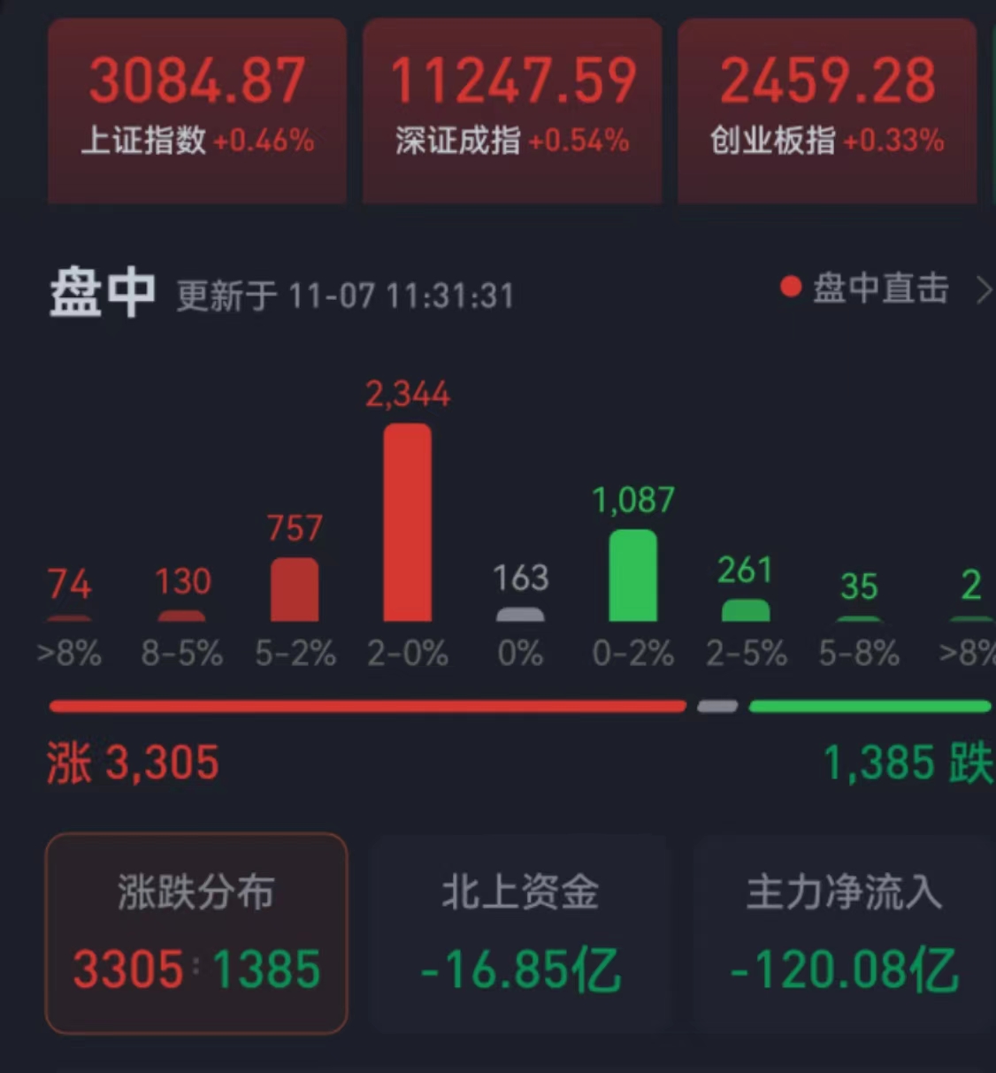 周一(11月7日),A股三大指數震蕩攀升,全線飄紅。截至上午收盤,上證指數漲幅達0.46%,報3084.87點;深證成指和創業板指漲幅分別為0.54%和0.33%;滬深兩市合計成交額6548.9億元,總體來看,兩市個股漲多跌少。