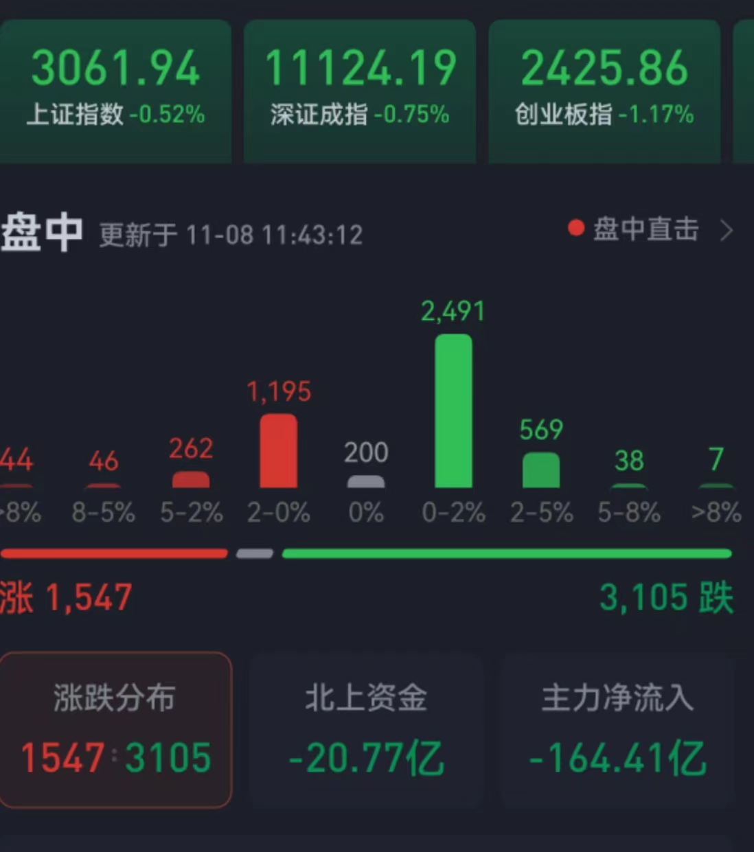 周二(11月8日),三大股指低開后震蕩走弱,全線下跌。截至上午收盤,上證指數跌幅達0.52%,報3061.94點;深證成指和創業板指跌幅分別為0.75%和1.17%;滬深兩市合計成交額5323.3億元,總體來看,兩市個股跌多漲少。