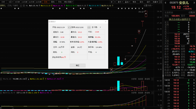 12月2日,安奈兒以19.12元封漲停板報(bào)收,漲幅達(dá)10.01%。該股自11月24日以來(lái),截至12月2日已連續(xù)7個(gè)交易日均以漲停價(jià)報(bào)收,累計(jì)漲幅達(dá)95.10%。該股最新A股總市值達(dá)40.55億元,A股流通市值23.31億元。