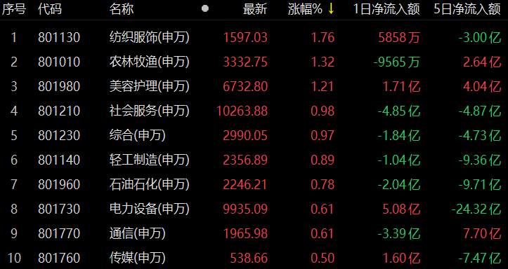 31類申萬(wàn)一級(jí)行業(yè)中,有17類上漲,其中,紡織服飾漲幅達(dá)1.76%,居首,農(nóng)林牧漁和美容護(hù)理緊隨其后,漲幅均超1%;下跌方面,房地產(chǎn)居首,跌幅達(dá)1.97%。