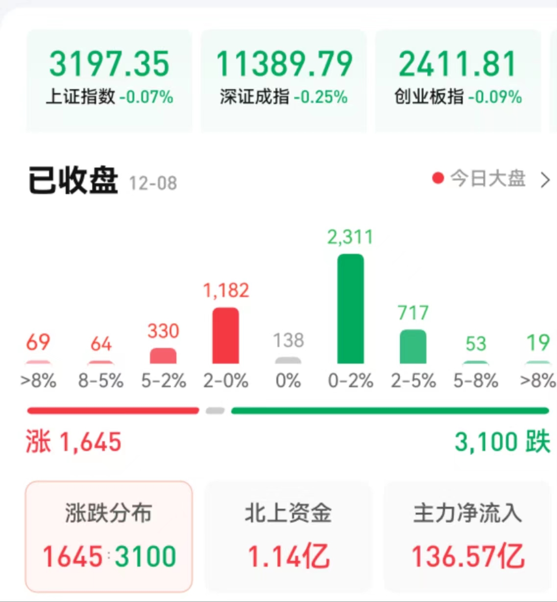 12月8日,A股三大指數震蕩回落。截至收盤,上證指數微跌0.07%報3197.35點,3200點得而復失;深證成指跌0.25%報11389.79點,創業板指跌0.09%報2411.81點,兩市合計成交額8698億元,北向資金凈買入1.14億元??傮w上看,A股個股跌多漲少,超3000只個股出現下跌,市場交投熱度繼續降低。