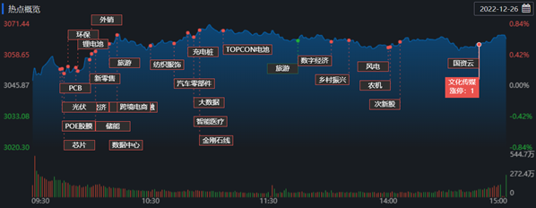 12月26日,A股三大指數(shù)高開高走,滬指開盤收復(fù)5日均線,距60日均線僅一步之遙。截至收盤,上證指數(shù)漲0.65%報(bào)3065.56點(diǎn);深證成指漲1.19%報(bào)10978.99點(diǎn),創(chuàng)業(yè)板指漲1.98%報(bào)2331.41點(diǎn),A股合計(jì)成交額6246.01億元。總體上看,A股個(gè)股漲多跌少,有3729只上漲,1171只下跌。