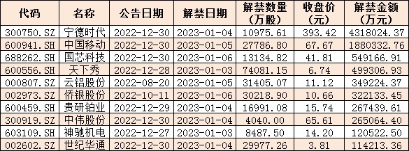 與此同時,統計顯示,本周(1月3日-6日)共有55家公司合計31.37億股限售股陸續解禁,按最新收盤價計算,解禁市值為932.67億元。從解禁市值來看,寧德時代(431.8億元)、中國移動(188.03億元)等公司解禁金額均超180億元。