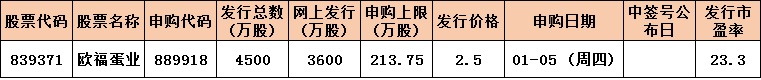 根據發行安排,本周(2023年1月3日-6日)有1只新股發行,周四安排1只,歐福蛋業。