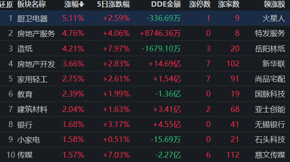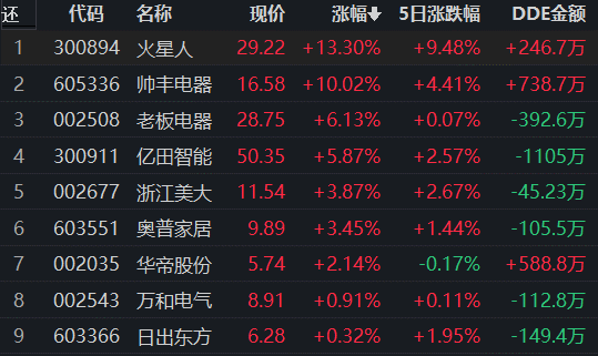 從早盤表現強勢的廚衛電器行業看,交易中的9只成份股全線上漲,其中4只漲幅超5%。資金流向看,廚衛電器行業大單資金凈流入額為-336.69萬元,居行業第28位,排名第一的房地產開發行業,大單資金凈流入額為14.69億元。