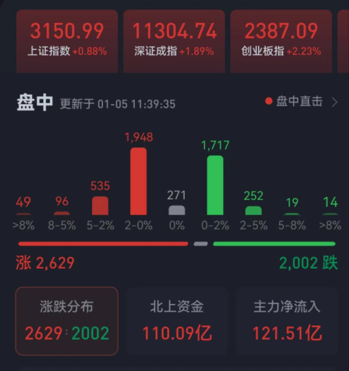 周四(1月5日),三大股指繼續震蕩走強,全線飄紅。截至上午收盤,上證指數漲幅達0.88%,報3150.99點;深證成指和創業板指漲幅分別為1.89%和2.23%;滬深兩市合計成交額5373.4億元,總體來看,兩市個股漲多跌少,上漲個股超2600只,其中,漲停個股達40只,跌停個股達8只。