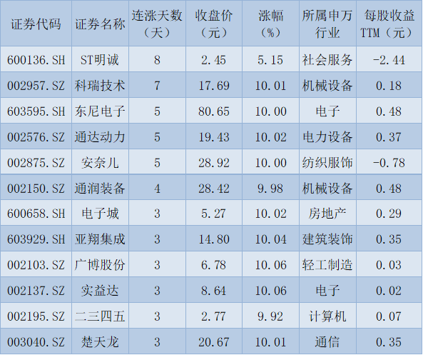 漲停股方面,今日有31只個股以漲停價報收,其中,有12只個股,股價已連續上漲超過3個交易日;跌停方面,有13只個股跌停價報收。從申萬一級行業看,房地產和電子行業漲停股數量并列居首,均為5只。