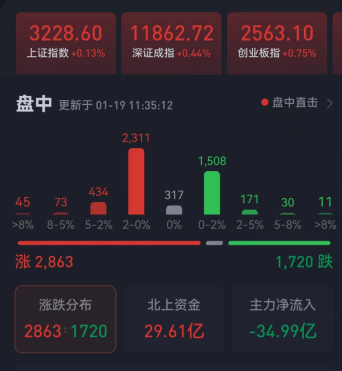 周四(1月19日),三大股指震蕩攀升,全線飄紅。截至上午收盤,上證指數漲幅達0.13%,報3228.60點;深證成指和創業板指漲幅分別為0.44%和0.75%;滬深兩市合計成交額3880.2億元。總體來看,兩市個股漲多跌少,其中,漲停個股達31只,跌停個股達10只。