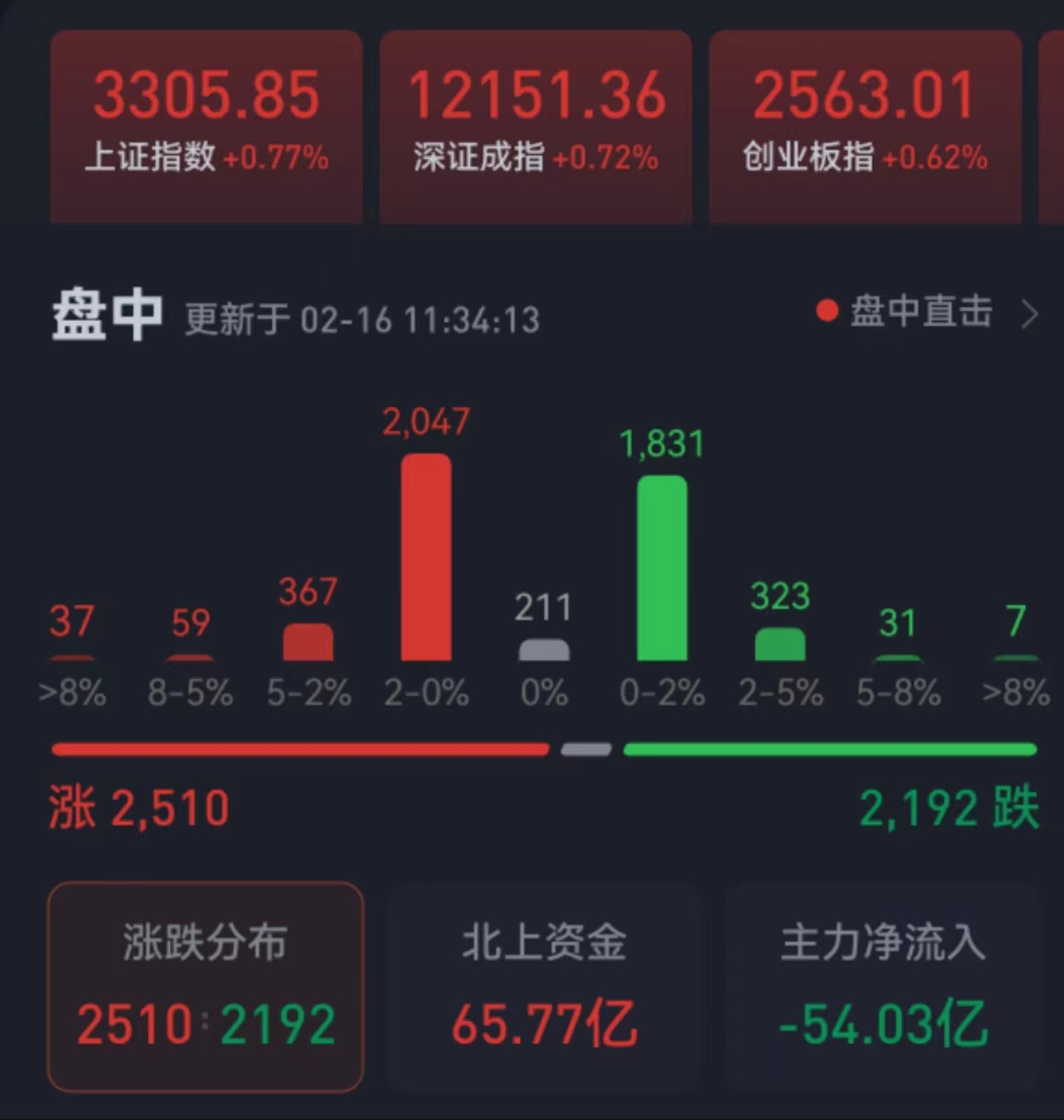 周四(2月16日),三大股指震蕩走高,全線飄紅。截至上午收盤,上證指數(shù)漲0.77%,報(bào)3305.85點(diǎn),突破3300點(diǎn)整數(shù)關(guān)口;深證成指和創(chuàng)業(yè)板指漲幅分別為0.72%和0.62%;滬深兩市合計(jì)成交額5963億元,總體來(lái)看,兩市個(gè)股漲多跌少。