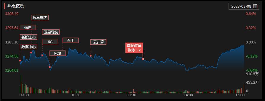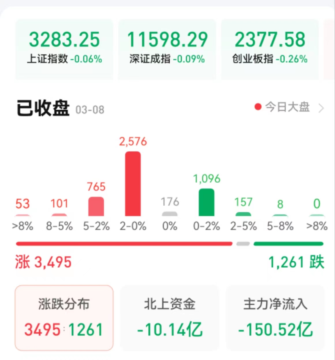 周三(3月8日),A股三大指數震蕩整理,小幅回落。截至收盤,上證指數微跌0.06%報3283.25點,深證成指跌0.09%報11598.29點,創業板指跌0.26%報2377.58點;兩市合計成交金額達7185億元,北向資金凈賣出10.14億元。總體上看,兩市個股漲多跌少。其中,漲停個股達40只,沒有跌停個股。