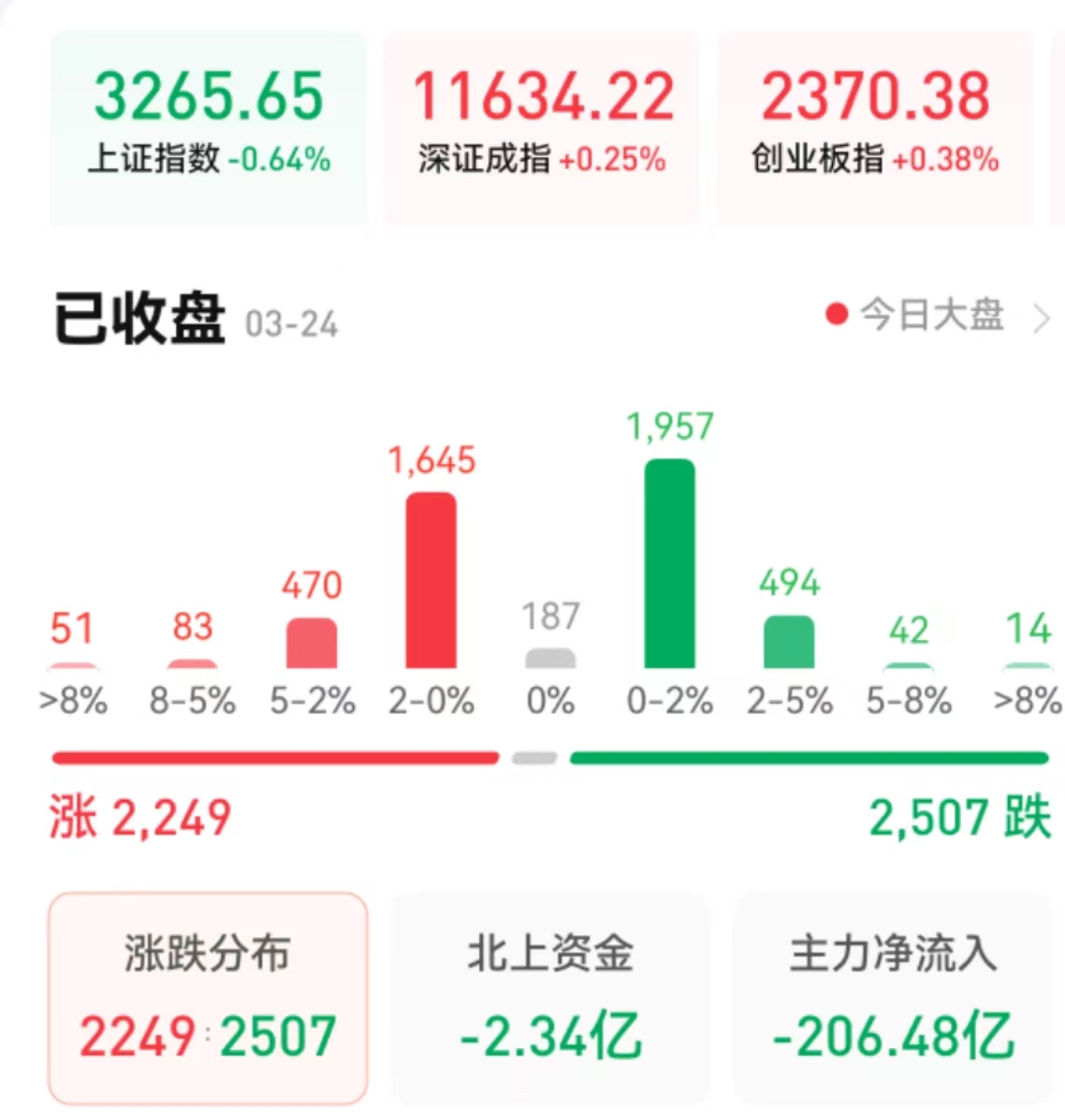 周五(3月24日),A股三大指數震蕩分化,漲跌不一。截至收盤,上證指數跌0.64%報3265.65點,深證成指漲0.25%報11634.22點,創業板指漲0.38%報2370.38點;兩市合計成交金額達10748億元,連續第2個交易日成交額突破萬億元,北向資金凈賣出2.34億元。總體上看,兩市個股跌多漲少。其中,漲停個股達30只,跌停個股達6只。