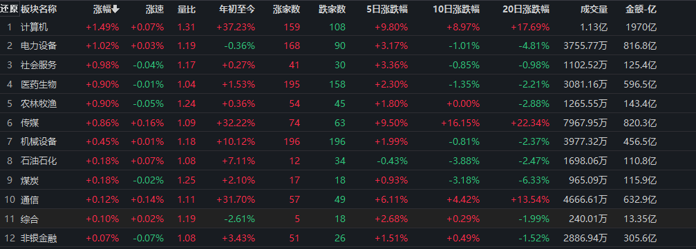 計(jì)算機(jī)、電力設(shè)備均漲超1%
