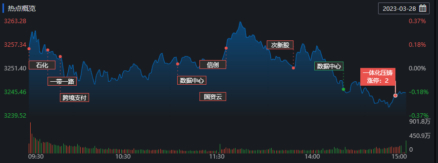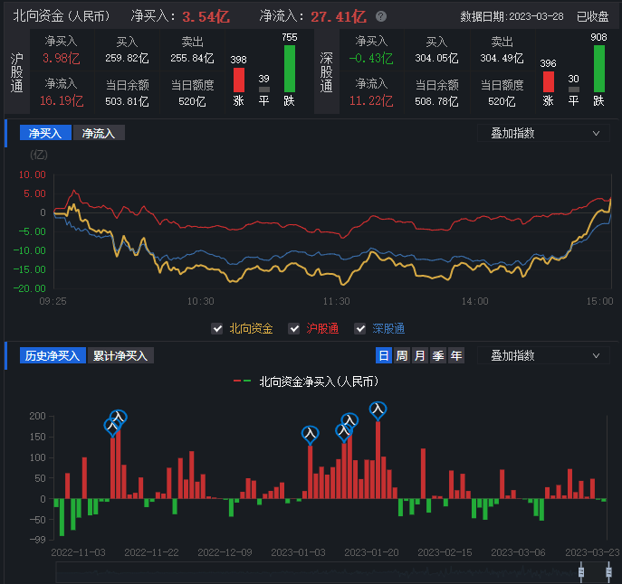 3月28日,滬深兩市三大指數集體下跌,滬指窄幅震蕩,創業板指止步五連漲。截至收盤,上證指數跌0.19%報3245.38點;深證成指跌0.72%報11564.45點,創業板指跌1.20%報2369.17點,A股合計成交額10045.17億元,已連續4個交易日突破萬億元;北向資金全天凈買入3.54億元;其中滬股通凈買入3.98億元,深股通凈賣出0.43億元。總體上看,A股中下跌個股數量居多,有3494只下跌,1396只上漲。