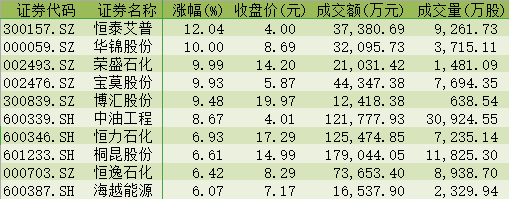 表:今日石油石化行業漲幅前十個股一覽