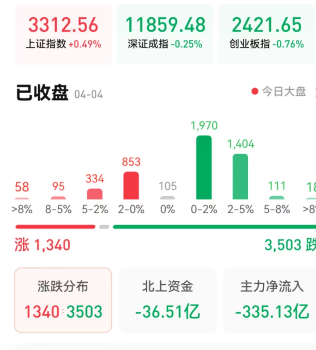 周二(4月4日),A股三大股指震蕩分化。截至收盤,上證指數漲0.49%,報3312.56點;深證成指跌0.25%,報11859.48點;創業板指跌0.76%,報2421.65點。兩市合計成交額13246億元,連續第2個交易日突破萬億元;北向資金凈賣出36.51億元;總體來看,A股個股跌多漲少,其中,漲停個股達26只,跌停個股達8只。
