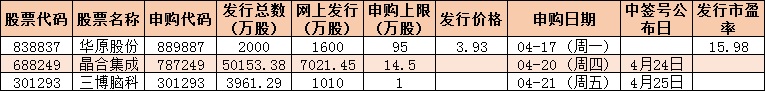 根據發行安排,下周(4月17日—21日)有3只新股發行,其中創業板1只,科創板1只,北交所1只。分別為華原股份、晶合集成、三博腦科。
