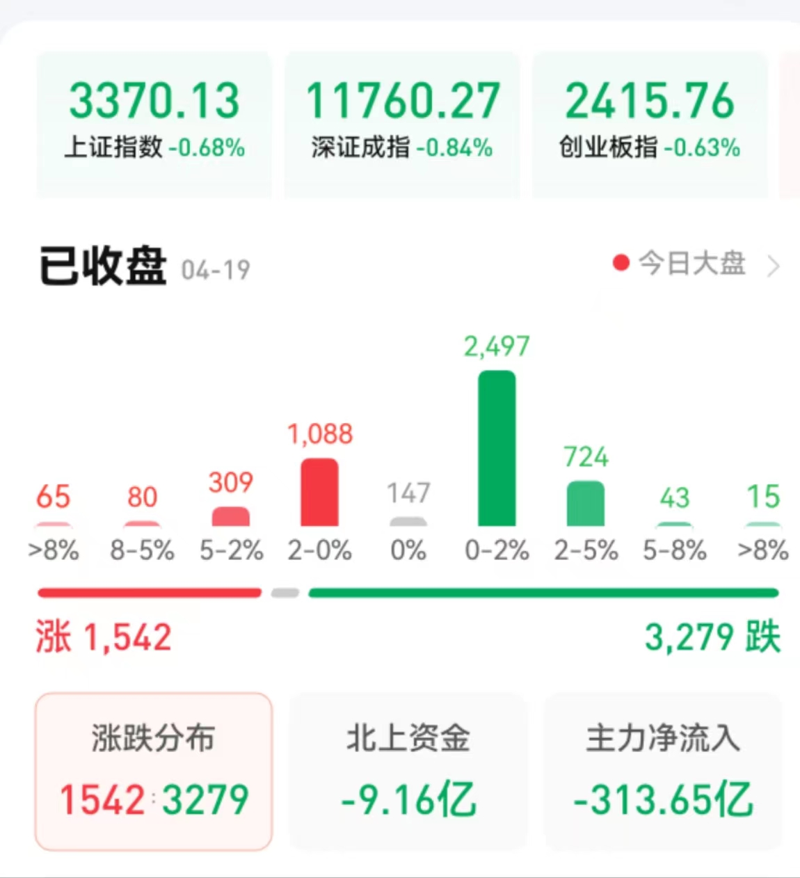 周三(4月19日),A股三大股指震蕩回落。截至收盤,上證指數跌0.68%,報3370.13點;深證成指跌0.84%,報11760.27點;創業板指跌0.63%,報2415.76點。滬深兩市合計成交額10826.26億元,連續第12個交易日突破萬億元;北向資金凈賣出9.16億元;總體來看,A股個股跌多漲少,其中,漲停個股達32只,跌停個股達18只。