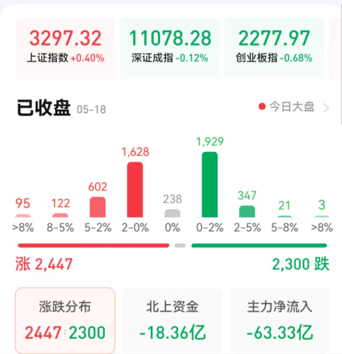周四(5月18日),A股三大股指震蕩分化,漲跌不一。截至收盤,上證指數漲0.4%報3297.32點,深證成指跌0.12%報11078.28點,創業板指跌0.68%報2277.97點,科創50指數漲0.5%;兩市合計成交8799億元,北向資金凈賣出18.36億元。總體上看,兩市個股漲多跌少。其中,漲停個股達49只,跌停個股達21只。