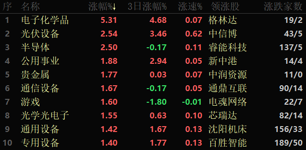 從早盤表現(xiàn)強(qiáng)勢的電子化學(xué)品行業(yè)看,交易中的21只成分股有19只上漲,其中,有8只個股漲幅超5%。資金方面,有5.22億元大單資金凈流入該行業(yè),居各行業(yè)第3位。