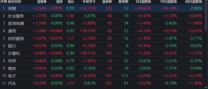 6月5日,從31類申萬一級行業看,有14類行業上漲,傳媒行業漲幅居首,達2.54%。所屬傳媒行業的138只個股中,124只個股上漲,占比近九成,其中,包括凡拓數創(20CM)、大晟文化、北京文化等在內的10只個股漲停。漲幅居前三位的行業分別為傳媒(2.54%)、社會服務(1.77%)、家用電器(1.54%)。下跌方面,電力設備居首,跌幅達1.80%,此外,食品飲料和有色金屬等兩類行業也均跌超1%。