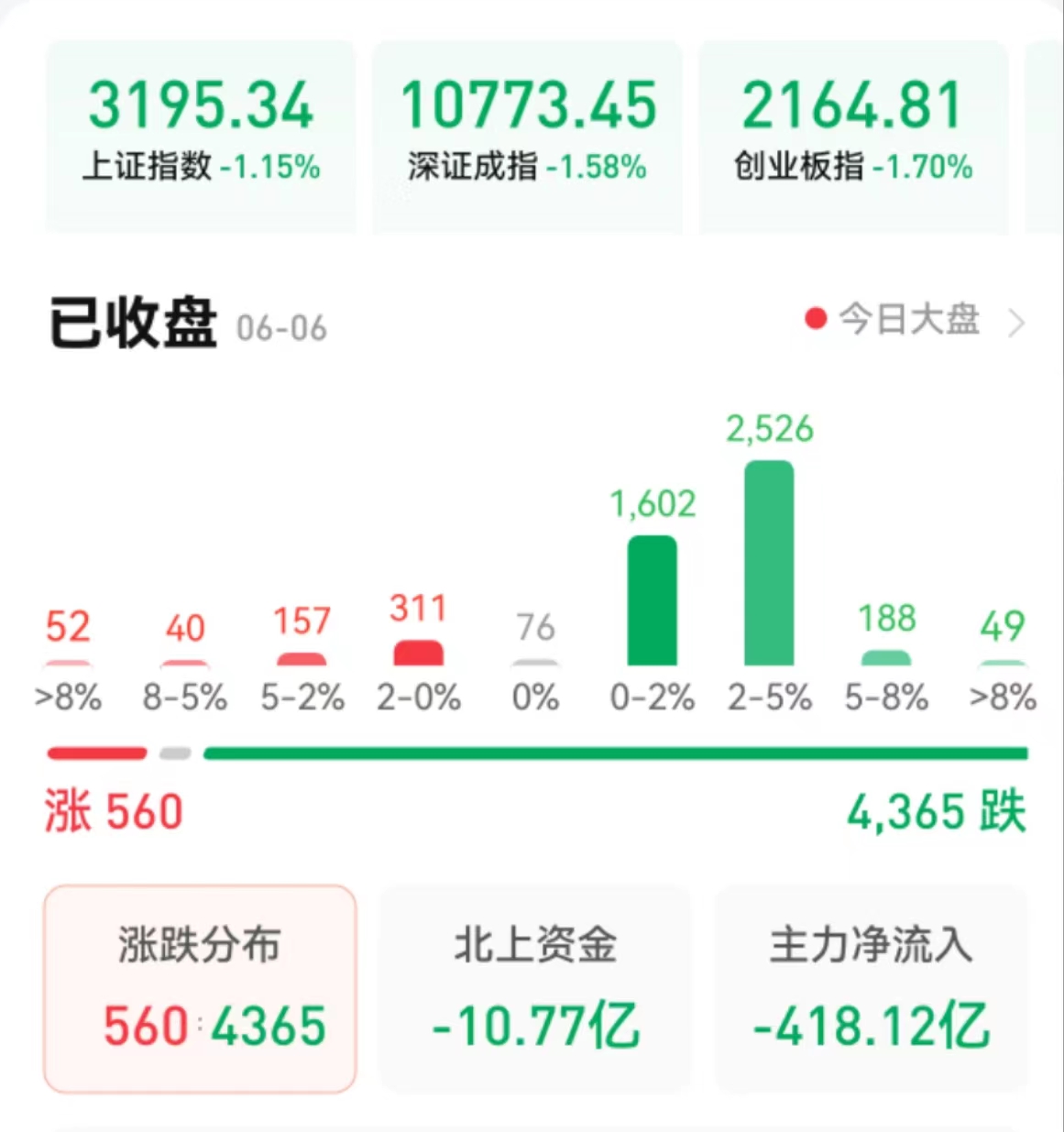 周二(6月6日),A股三大股指震蕩回落,全線下跌。截至收盤,上證指數跌1.15%報3195.34點,深證成指跌1.58%報10773.45點,創業板指跌1.70%報2164.81點;兩市合計成交9375億元,北向資金凈賣出10.77億元。總體上看,兩市個股跌多漲少。其中,漲停個股達50只,跌停個股達19只。