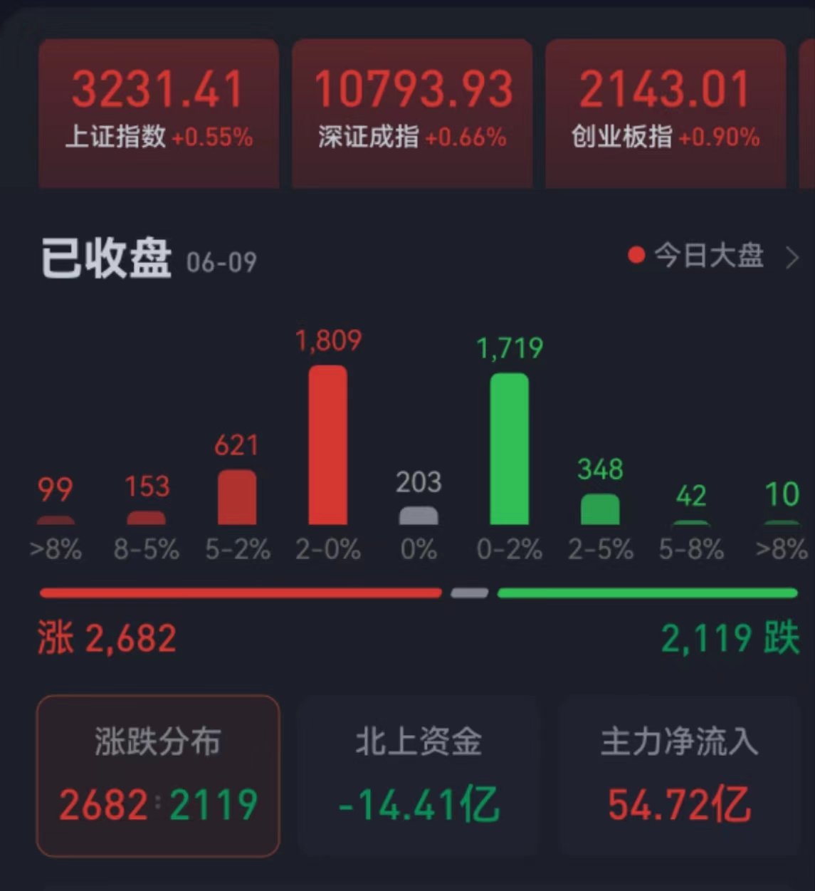周五(6月9日),A股三大股指震蕩上行,全線飄紅。截至收盤,上證指數漲0.55%報3231.41點,深證成指漲0.66%報10793.93點,創業板指漲0.90%報2143.01點;兩市合計成交9896億元,北向資金凈賣出14.41億元。總體上看,兩市個股漲多跌少。其中,漲停個股達74只,跌停個股達11只。