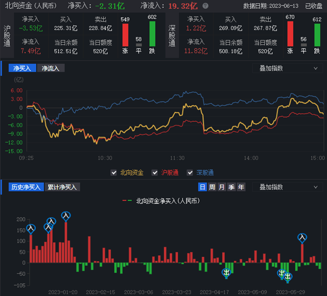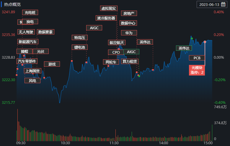6月13日,A股三大指數震蕩上漲,呈深強滬弱格局,深證成指略低開后快速翻紅,之后基本保持在紅盤以上。K線形態上,深證成指已走出4連陽,技術上已出現強勢信號。截至收盤,上證指數漲0.15%報3233.67點;深證成指漲0.76%報10955.96點,創業板指漲0.68%報2166.96點,A股合計成交額9434.61億元,較前一交易日縮減2.39%,已連續3天超9000億元;北向資金全天凈買入-2.31億元;其中滬股通凈買入-3.53億元,深股通凈買入1.22億元。今日A股漲多跌少,有2671只上漲,2262只下跌。